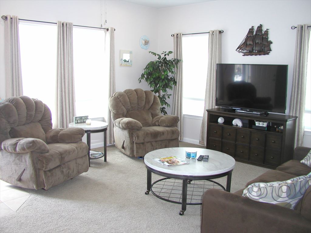 Side x Side rental with an open floor plan. Living room, kitchen and half bath downstairs. Three bedrooms and full bath upstairs. Three blankets supplied. 6 Beach badges and 3-5 beach chairs provided by owner but not guaranteed. Beach chairs are located under front deck. Gas grill is connected to natural gas line. Portable ice maker provided. Outdoor furniture is wrought iron and rattan. Brick paver patio available. Four night minimum rentals available in May, Sept and Oct, please call for rates. No smoking or vaping of any kind anywhere inside or outside of the property; otherwise, your security deposit will be forfeited.